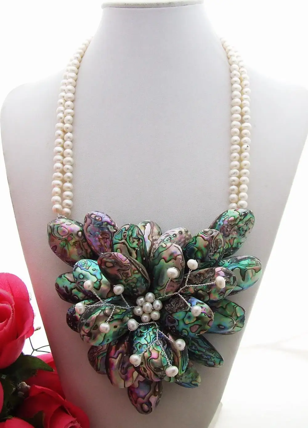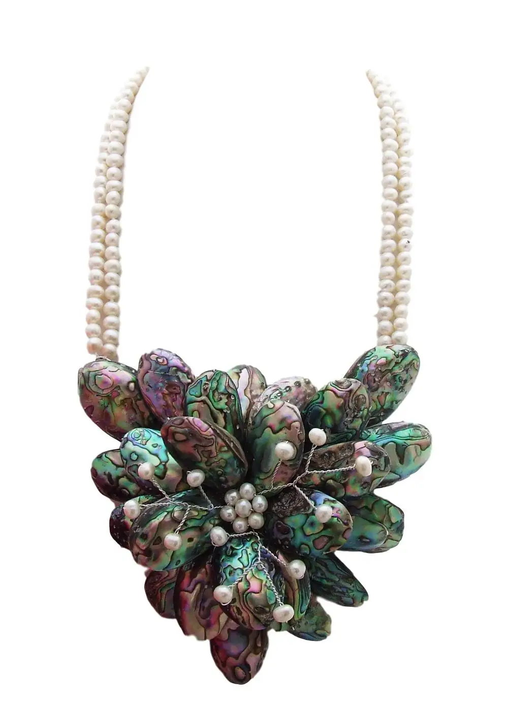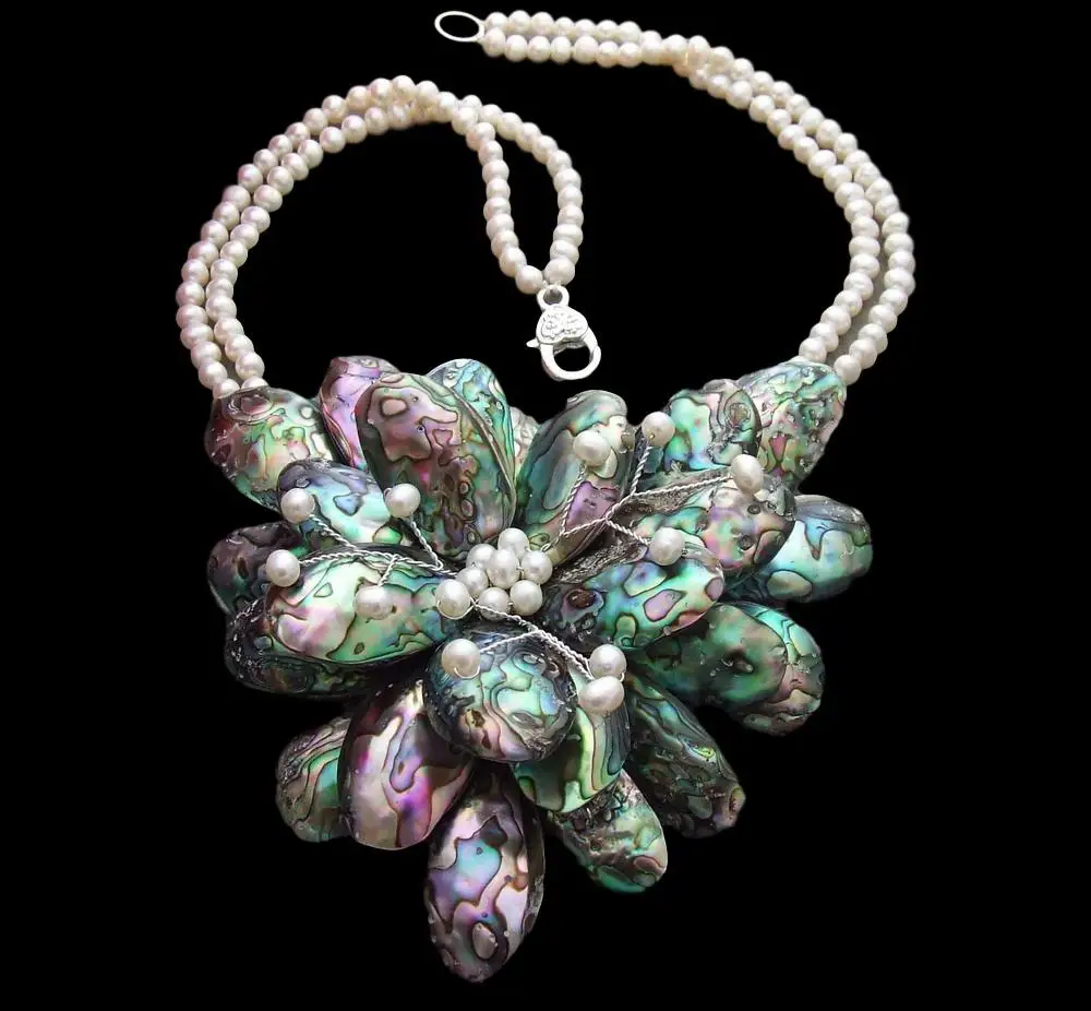 2 Strands Freshwater White Pearl Abalone Shell Flower Statement Necklace