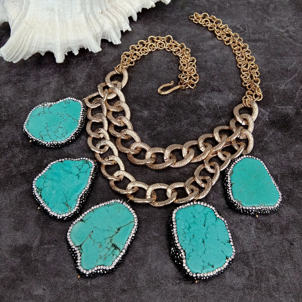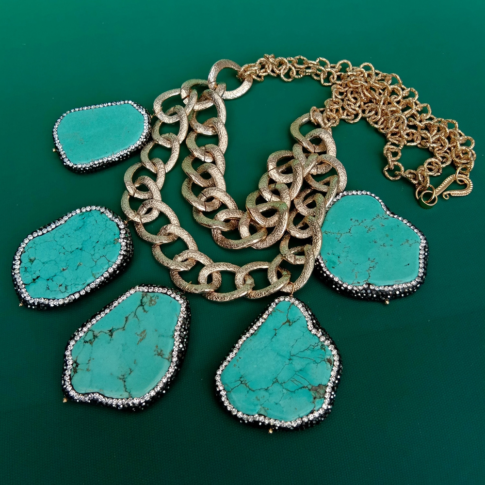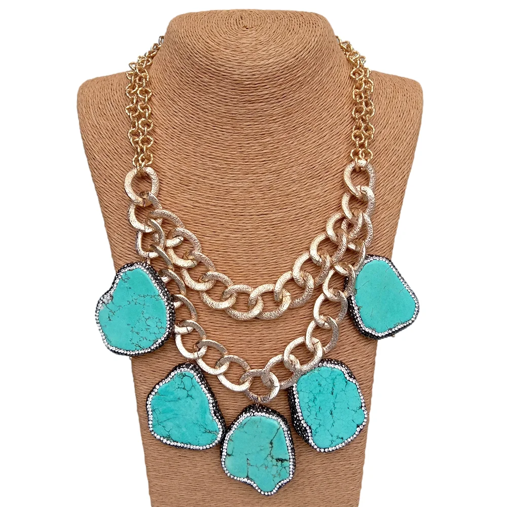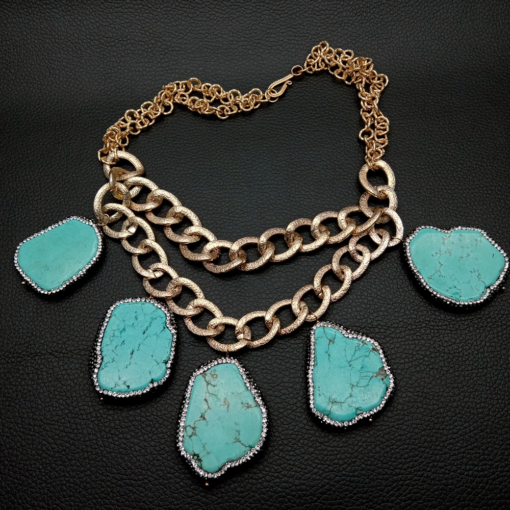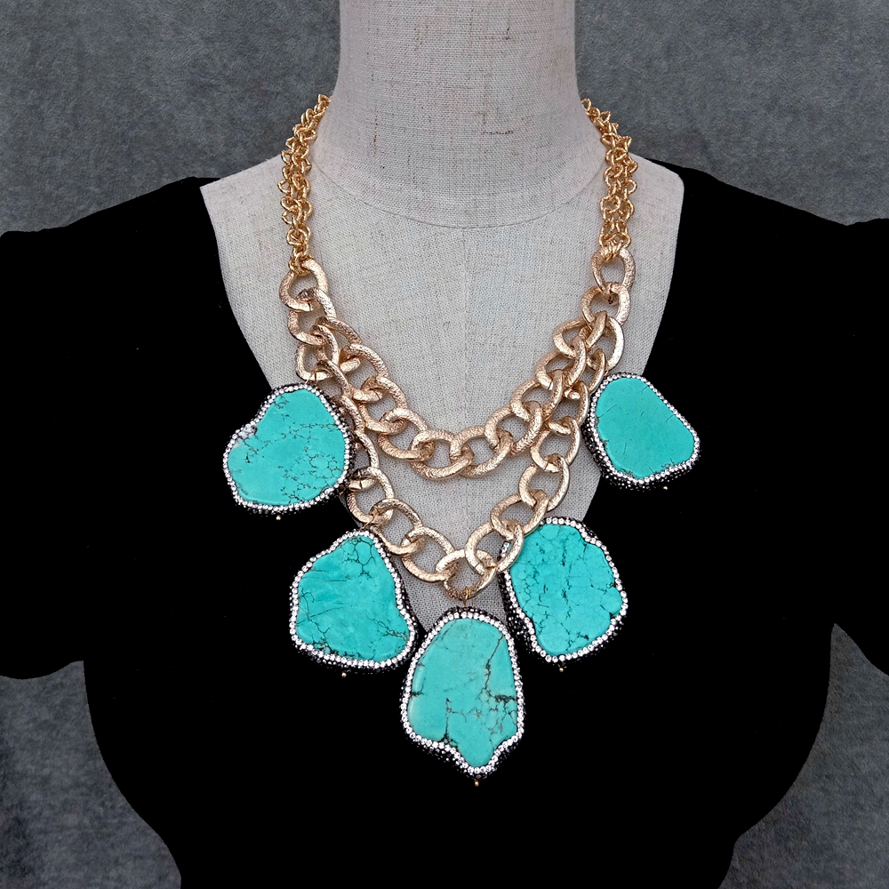 Blue Turquoise Crystal Pave Gold Plated Chain Statement Necklace Women Jewelry