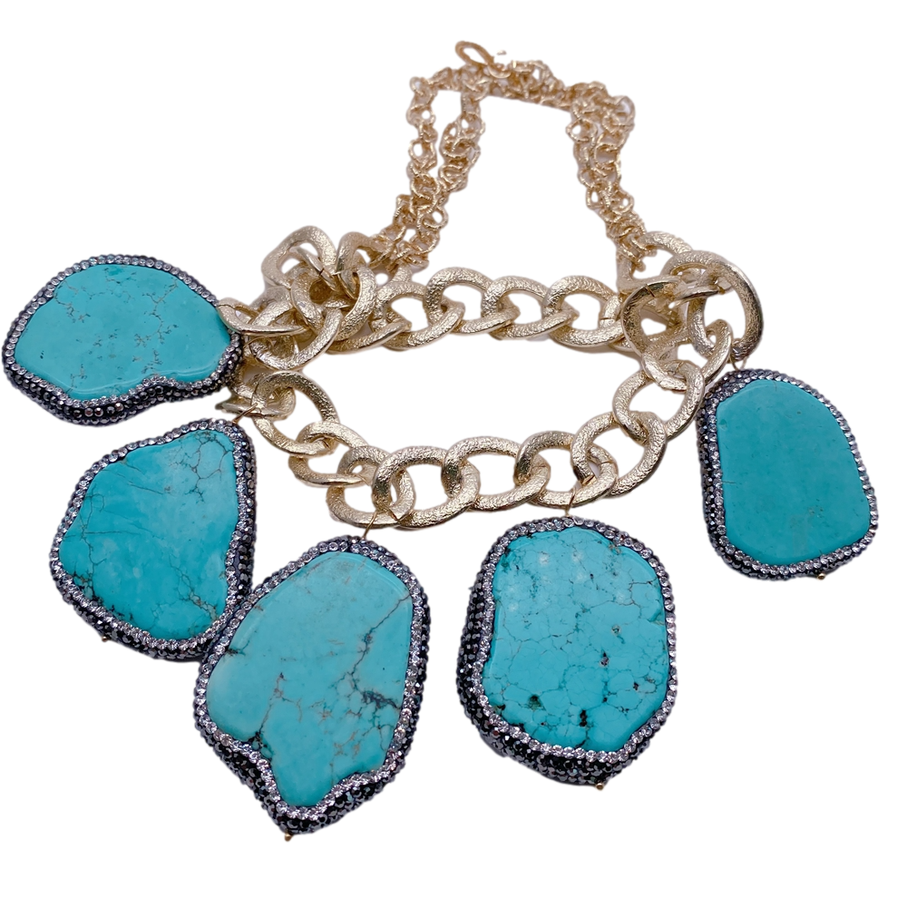 • Blue Turquoise Crystal Pave Gold Plated Chain Statement Necklace Women Jewelry