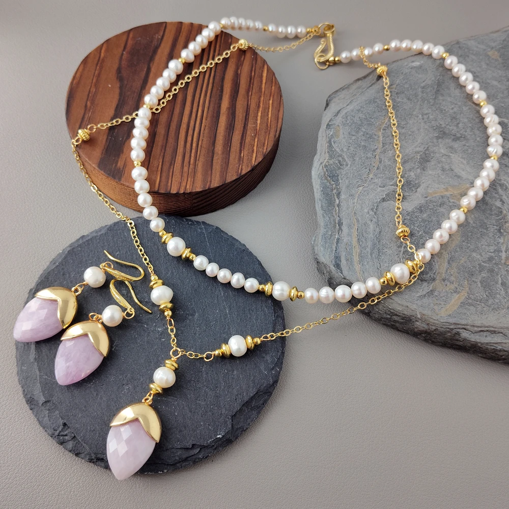 Multi Strands White Pearl Rosary Chain Necklace Real Pink Kunzite Pendant Earrings Set