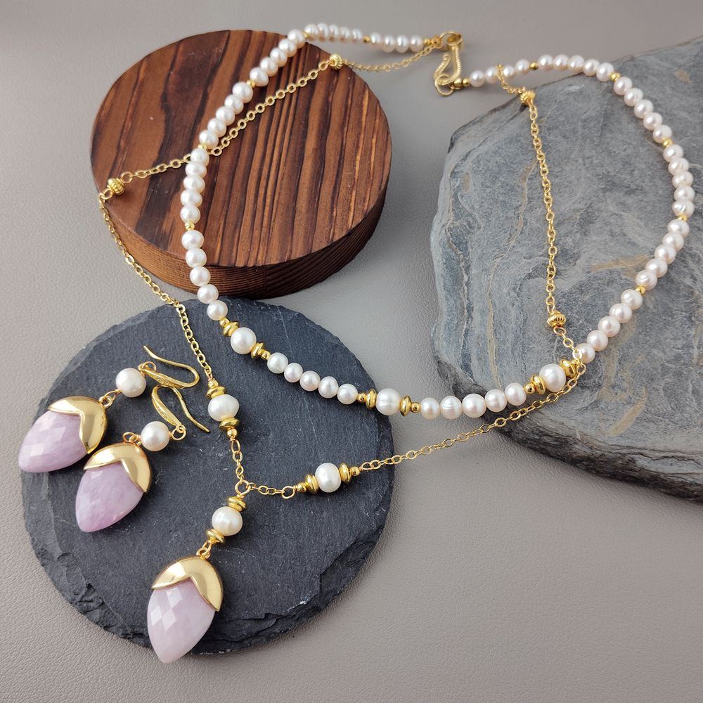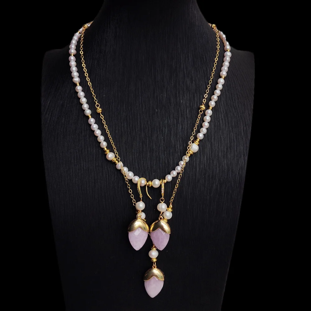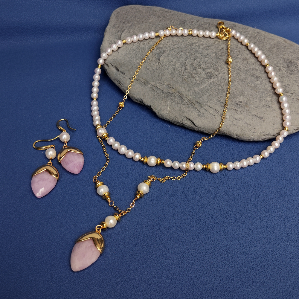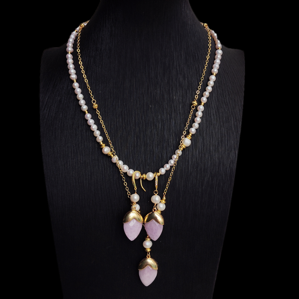 Gems Info:  cultured white potato pearl, natural pink kunzite pendant.